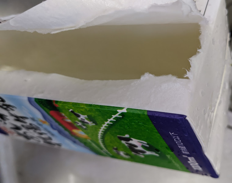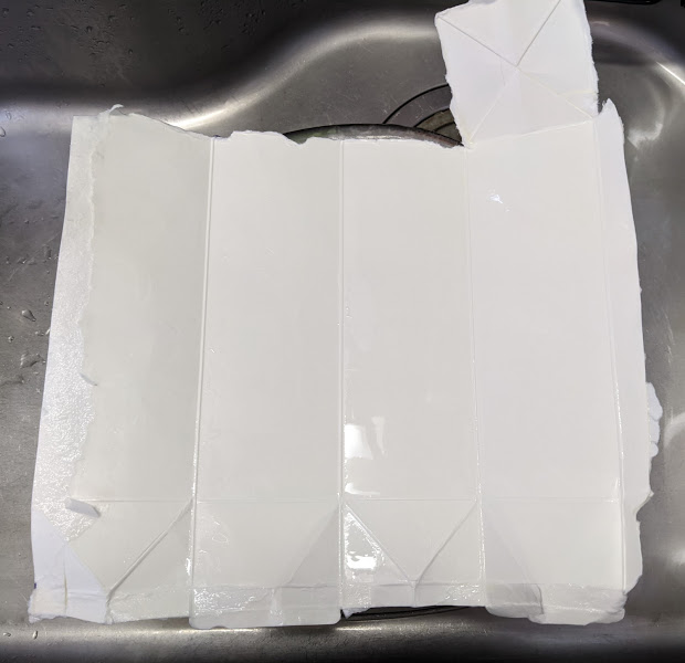 牛乳パックの中に水を入れて洗いながらこの部分を手で破ると、簡単にピリーっとはがれてきます。